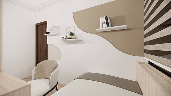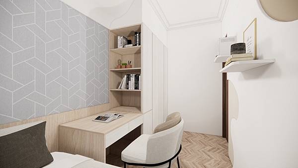 屋主保留三房,規劃成書房+臥榻+收納空間,書桌五尺規劃,收納約七尺寬、臥榻有標準單人床尺寸,臥榻下方還可做抽屜收納~